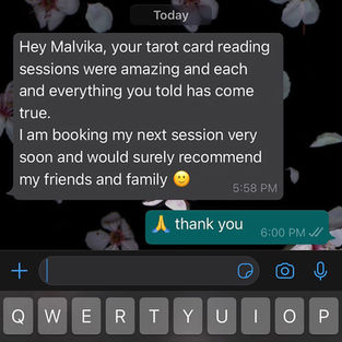 "Hey Malvika, I just wanted to take a moment to thank you for the fantastic tarot reading you provided me. Your reading was incredibly accurate, and your guidance on how to live my life spiritually was invaluable. Your advice has already helped me navigate some challenges, and I'm grateful for the clarity and perspective you've given me.
